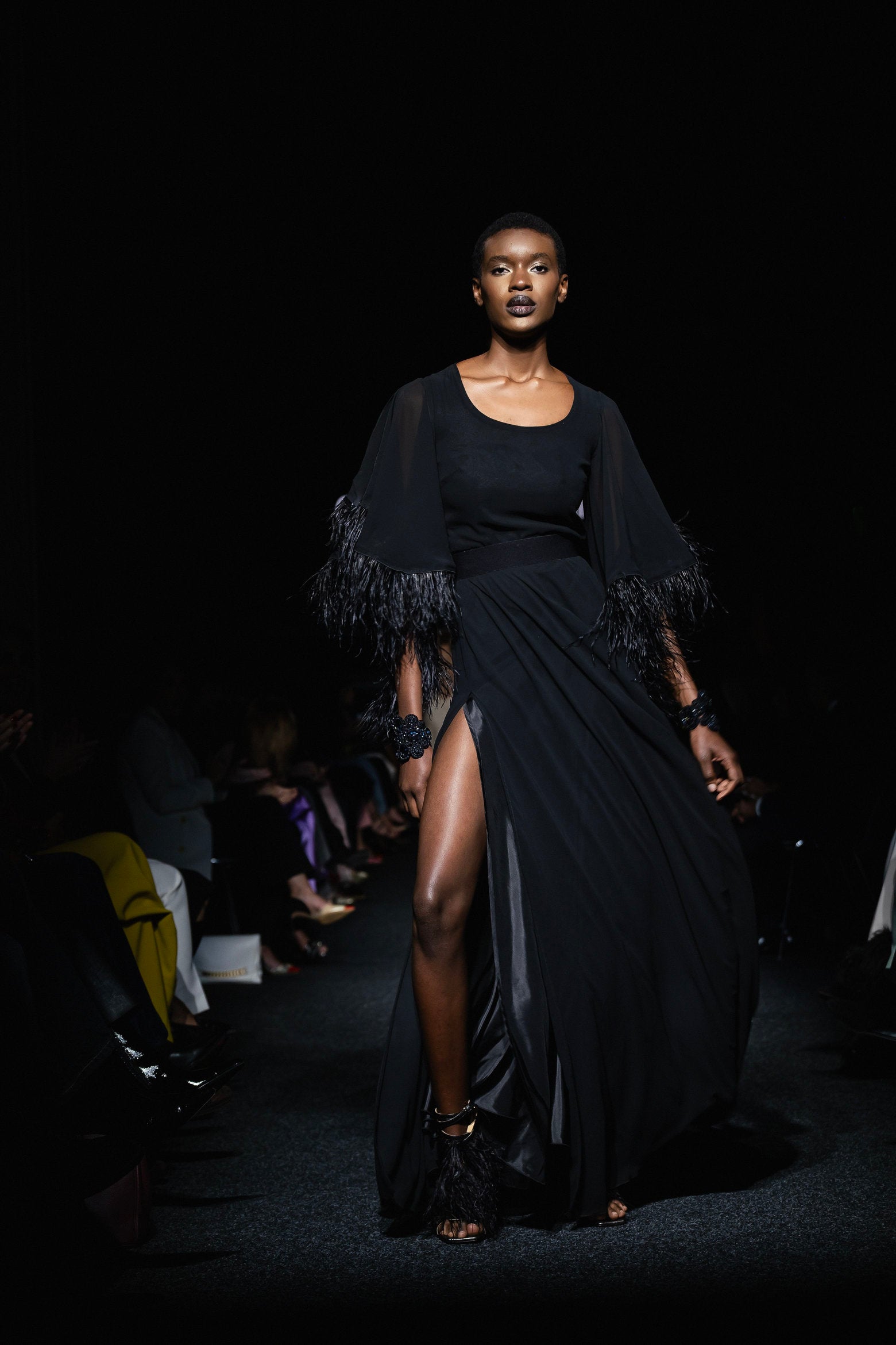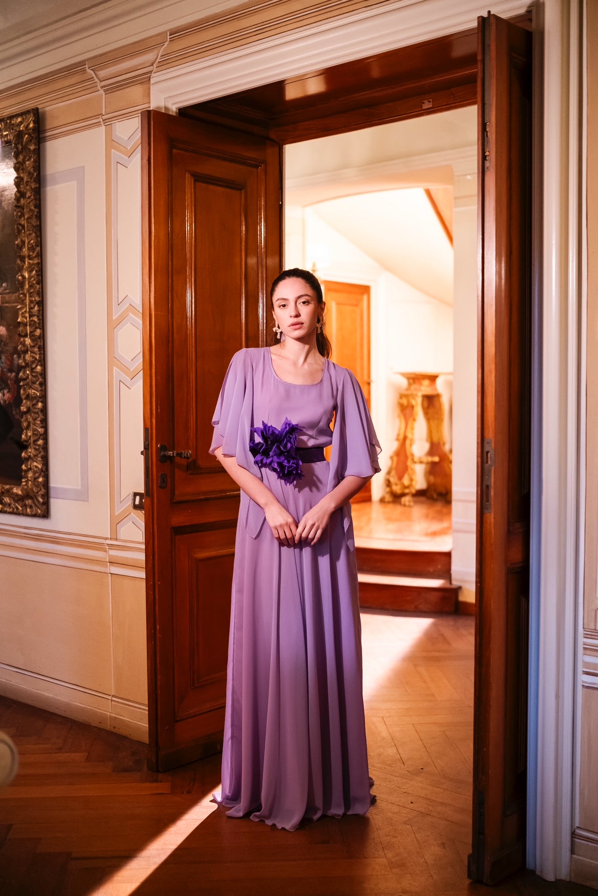 Un abito elegante e raffinato in georgette, con maniche con dettaglio a piume e un ampio spacco laterale. Lasciati sedurre dalla sua leggerezza e dalla sua comoda vestibilità. Perfetto per ogni occasione speciale, questo abito ti farà sentire sicura e glamour.