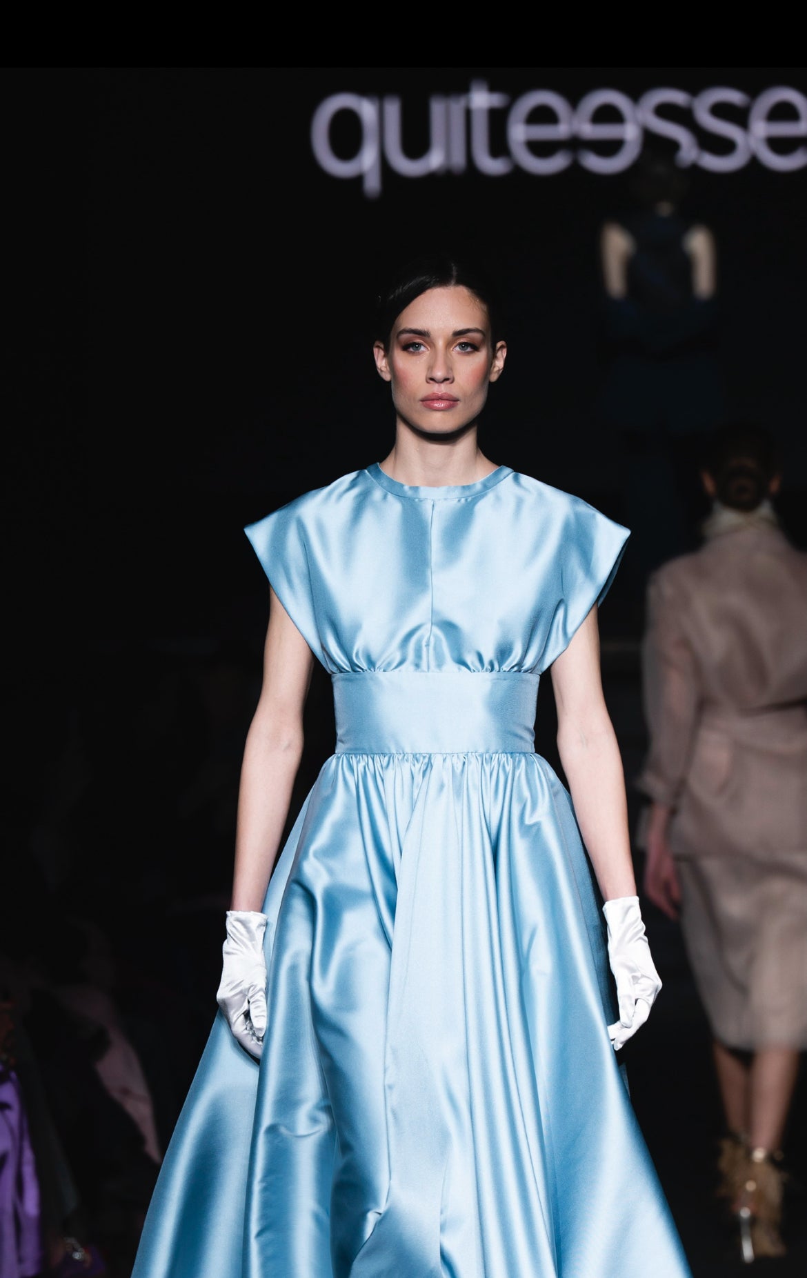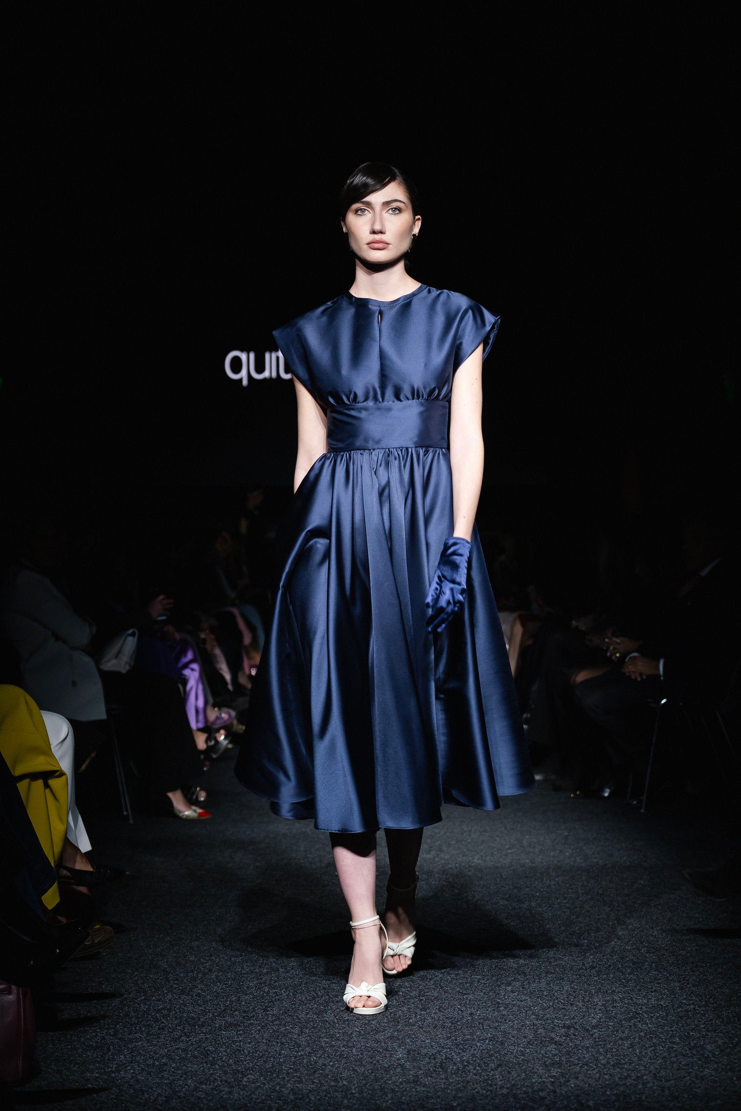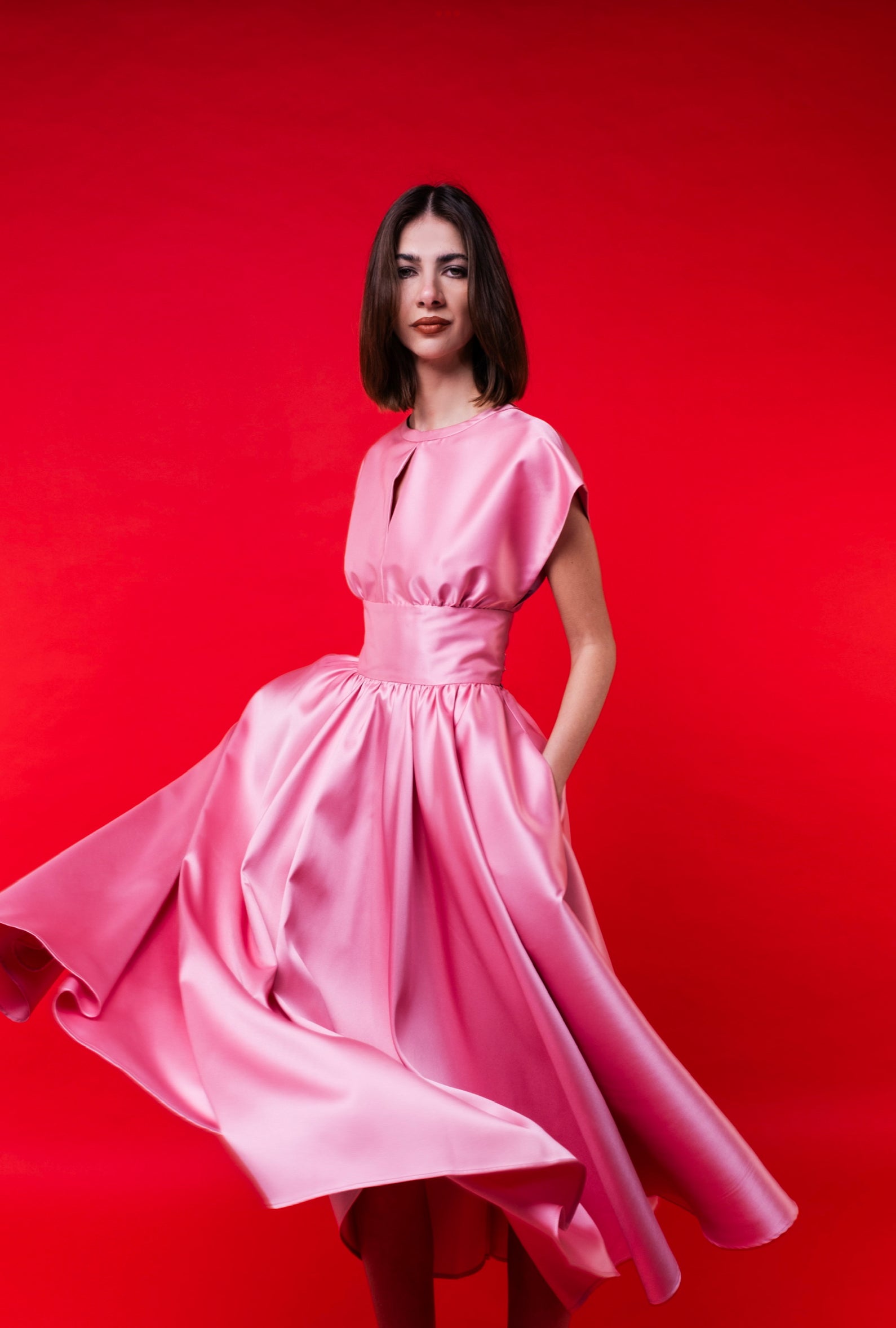 Questo abito in mikado dal sapore retrò non passa inosservato grazie al suo design elegante e alla raffinata apertura sulla schiena. Il taglio a punto vita enfatizza la silhouette femminile, offrendo un look sobrio e seducente allo stesso tempo. Perfetto per eventi speciali e occasioni di gala.