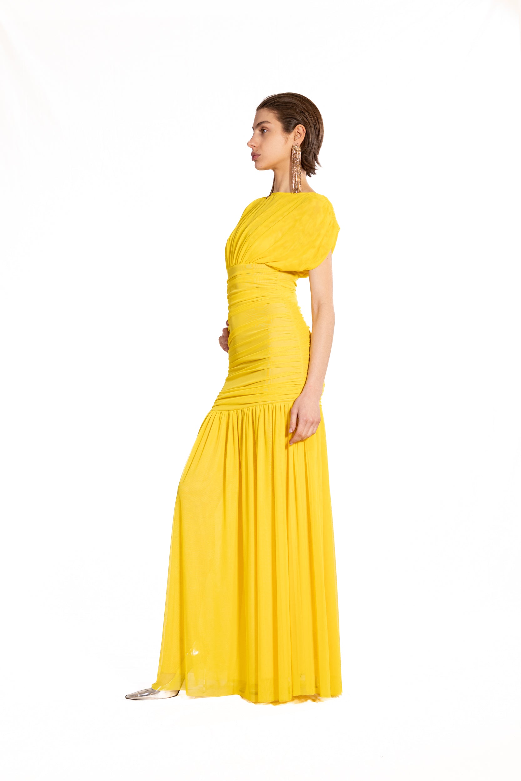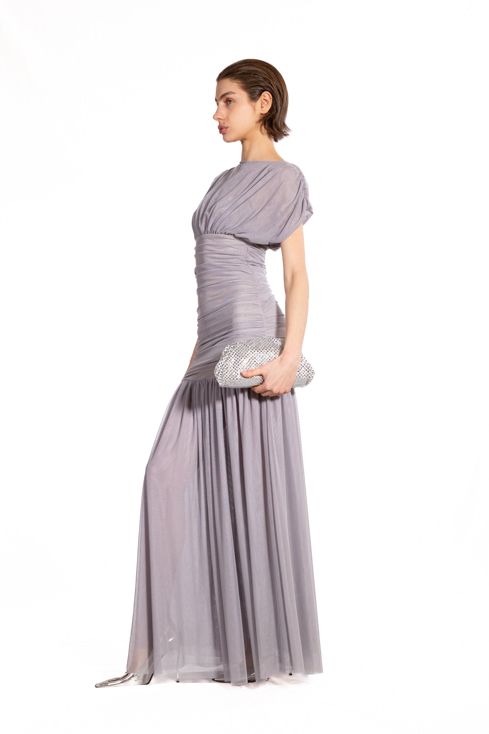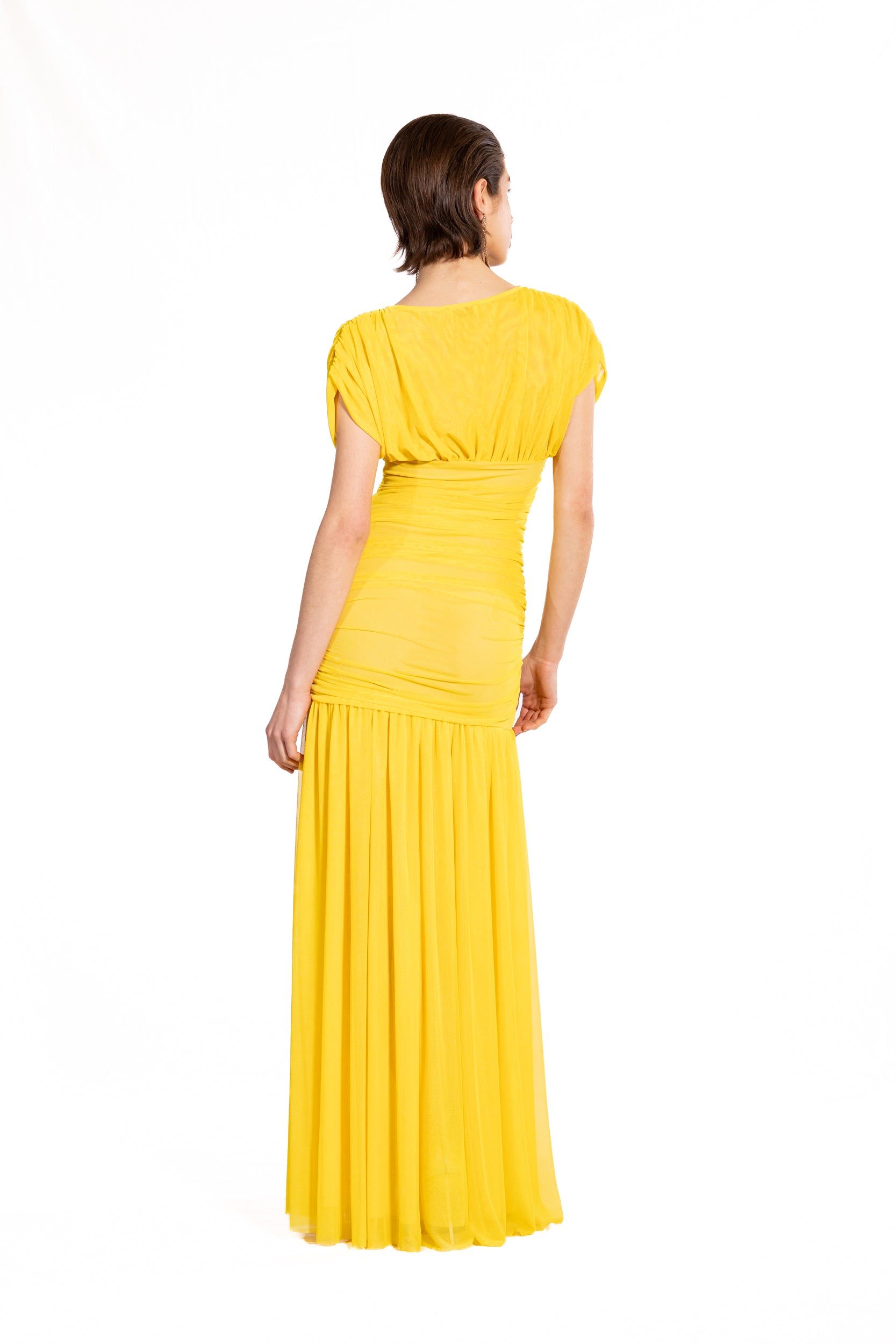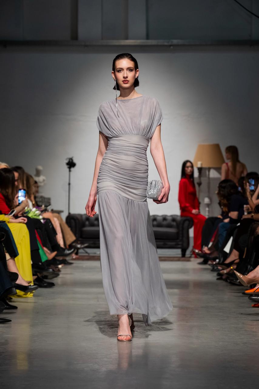Abito Vittoria in morbido jersey di tulle che abbraccia la silhouette con eleganza senza sforzo. Il drappeggio strategico sulle spalle crea un effetto sofisticato, mentre la vita alta definisce e valorizza le forme con un fitting impeccabile. Un capo che unisce comfort e raffinatezza, perfetto per chi desidera un look fluido e sensuale.