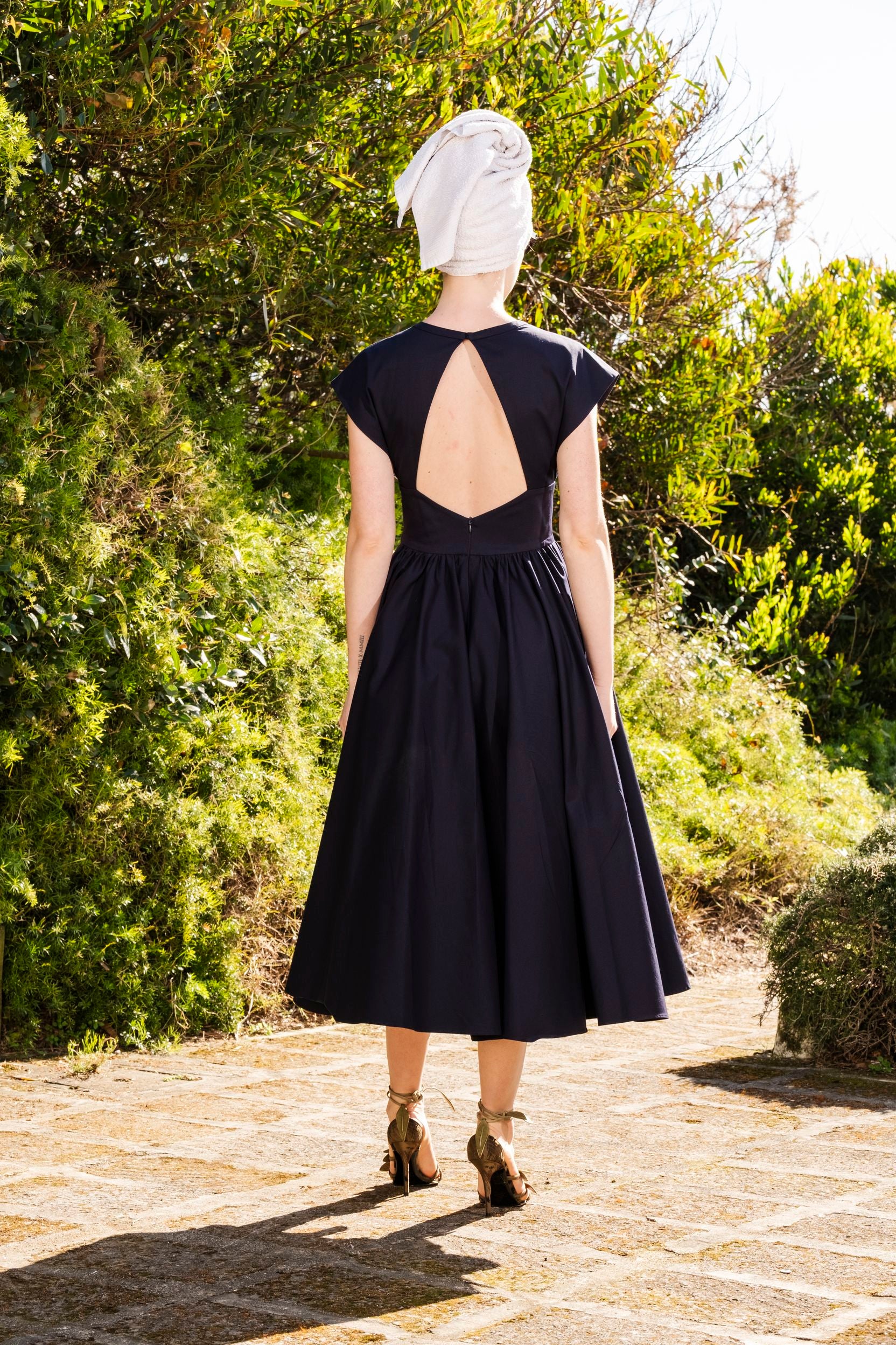 Abito in cotone dal sapore retrò, punto vita in evidenza, gonnone a ruota, oblò sulla schiena. Disponibile anche nella versione mikado