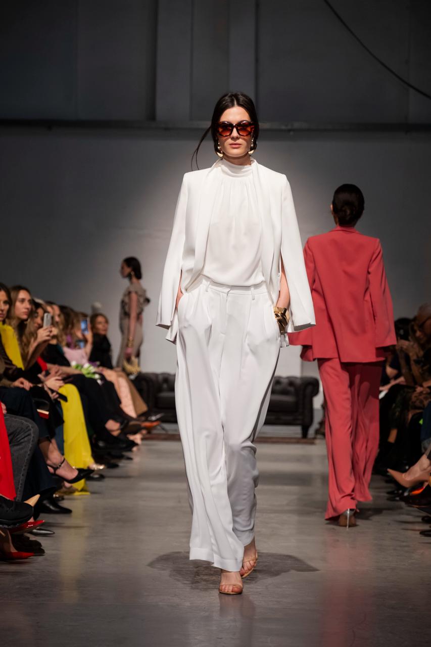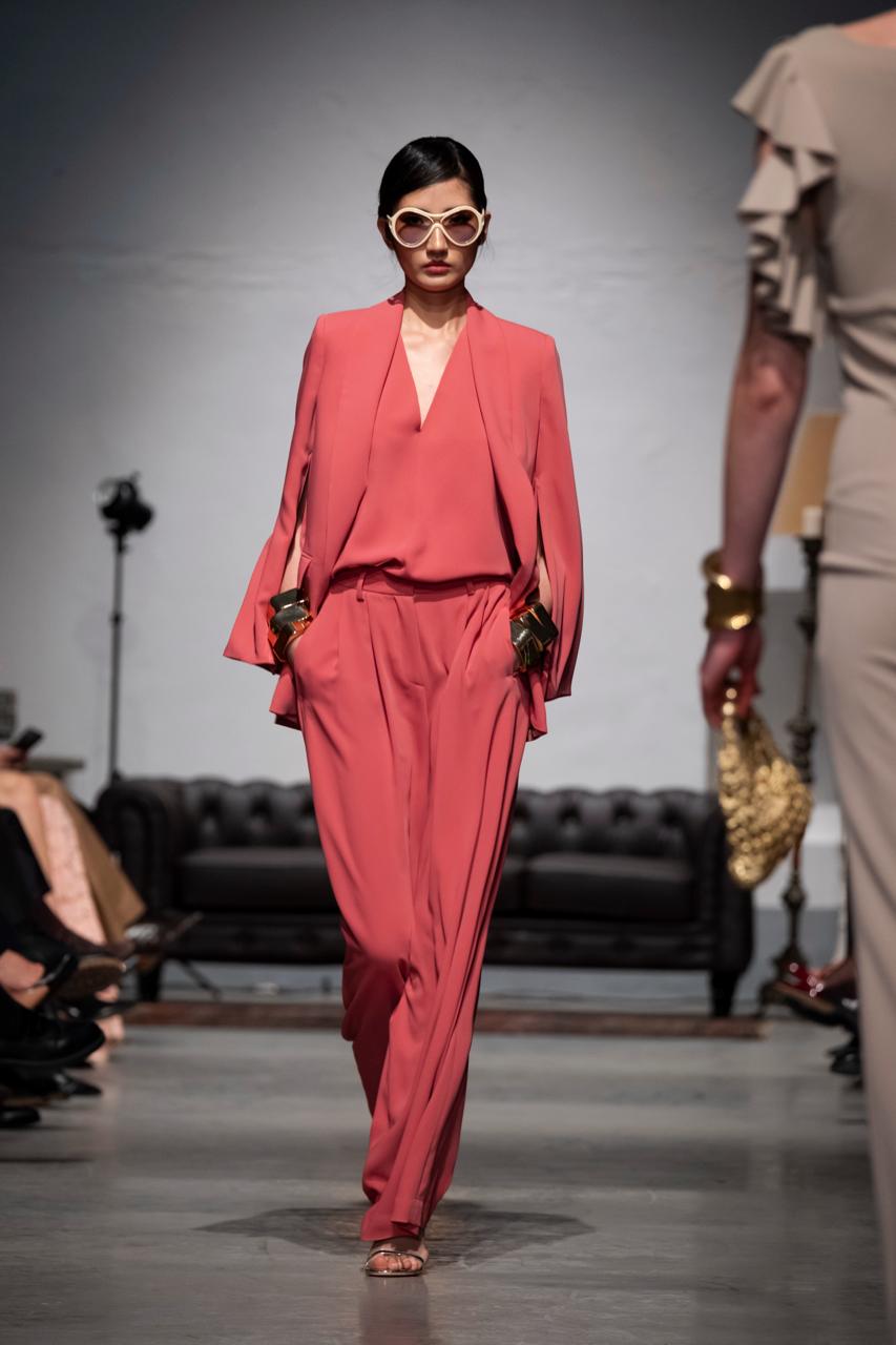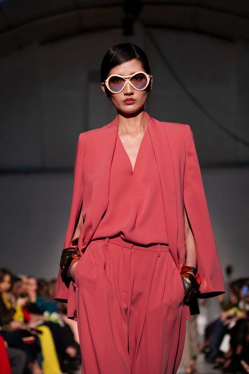 Blazer sciallato in morbido cadí fluido, con dettaglio sulla manica cherimane aperta sull’avambraccio.