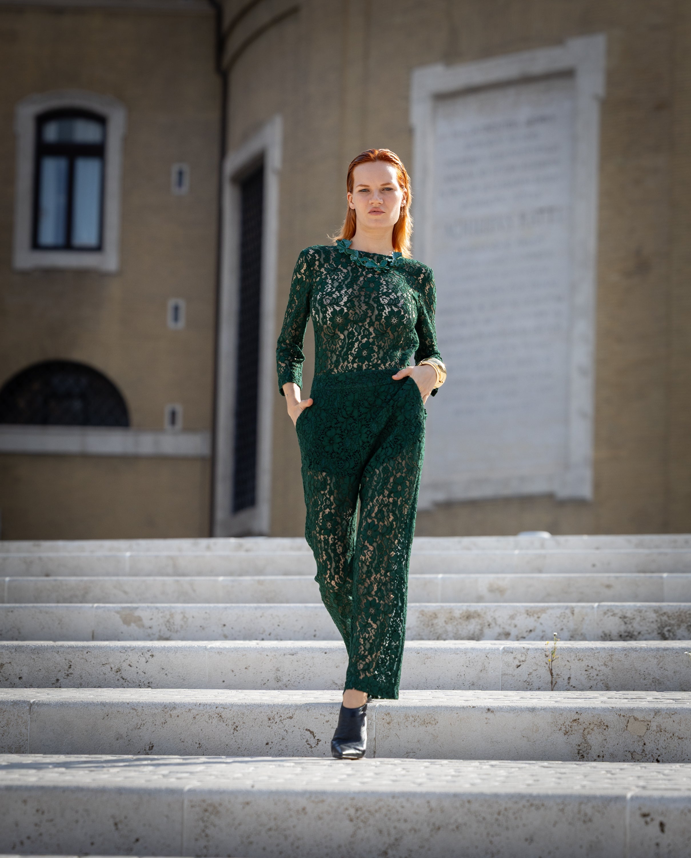 La Jumpsuit in pizzo Macramè a manica tre quarti con scollo a V posteriore, pantalone morbido stile cargo. Disponibile in diverse colorazioni.